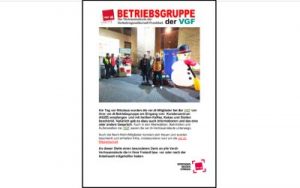 Am Tag vor Nikolaus wurden die ver.di-Mitglieder bei der VGF von ihrer ver.di-Betriebsgruppe am Eingang vom Kundenzentrum (KUZE) empfangen und mit heißem Kaffee, Kakao und Stollen beschenkt. Natürlich gab es dazu auch Informationen und das eine oder andere Gespräch. Auch in den...