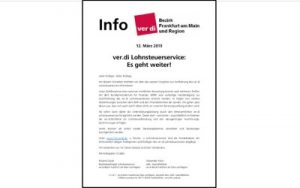 mit diesem Schreiben möchten wir über das weitere Vorgehen zur Fortführung des ver.di Lohnsteuerservice informieren. Unter Zuhilfenahme einer externen rechtlichen Bewertung konnte nach mehreren Treffen mit dem Bundesministerium für Finanzen (BMF) eine...